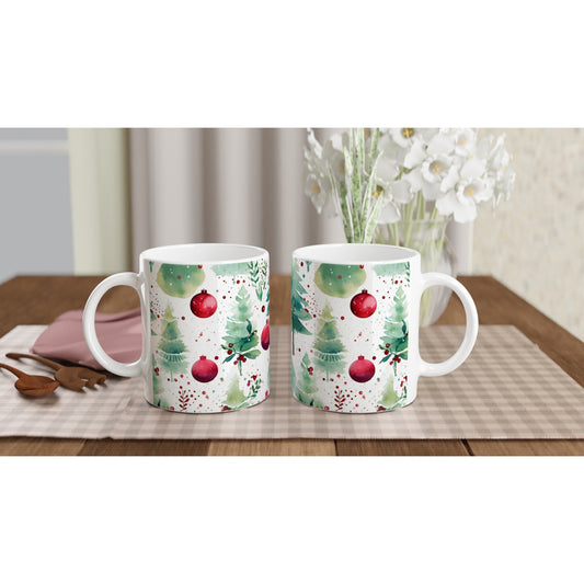 Enchanting Holidays: Watercolor Christmas Tree 11oz Ceramic Mug with Bauble Print