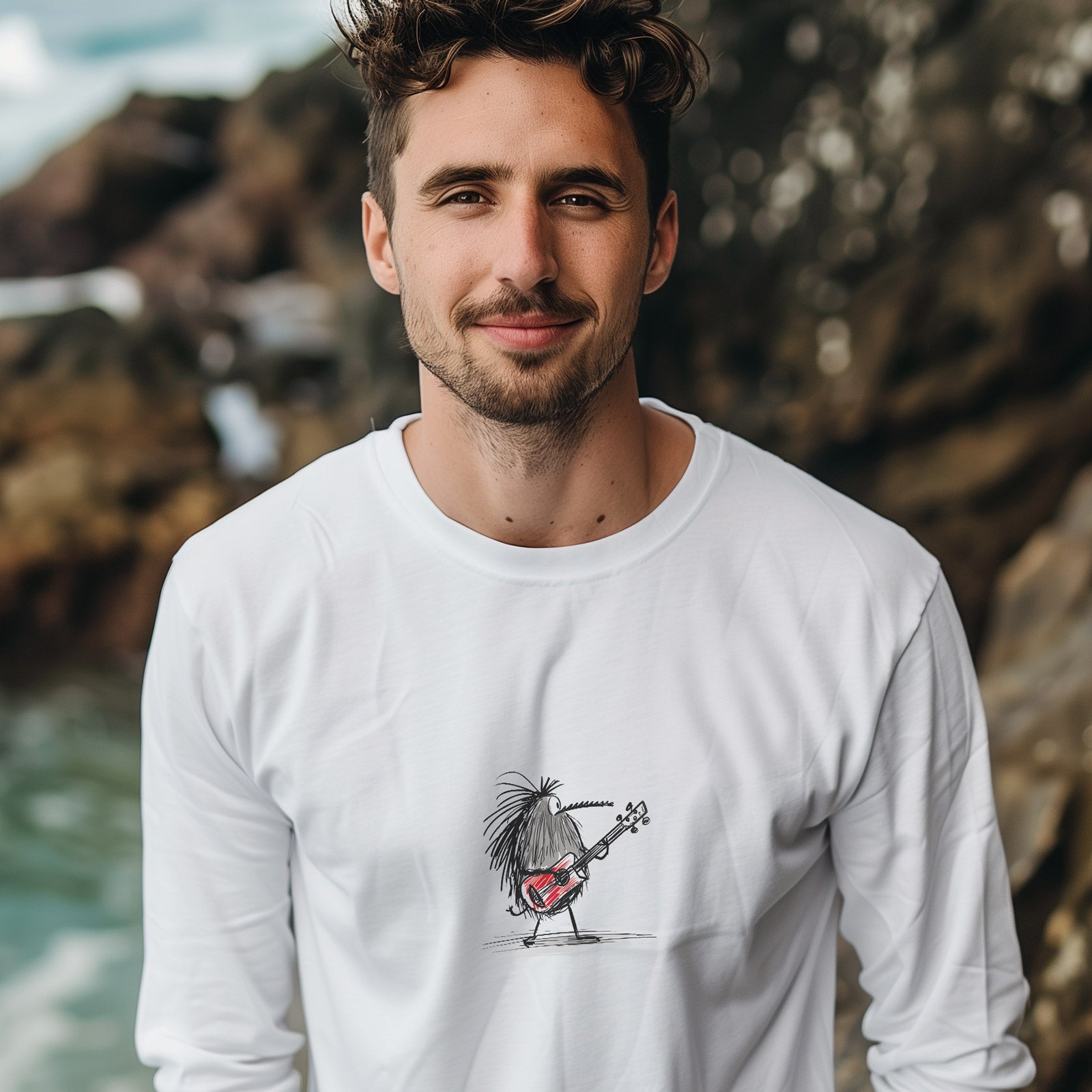 Unisex Longsleeve T-shirt with New Zealand Kiwi Bird Playing Guitar Sketch Print