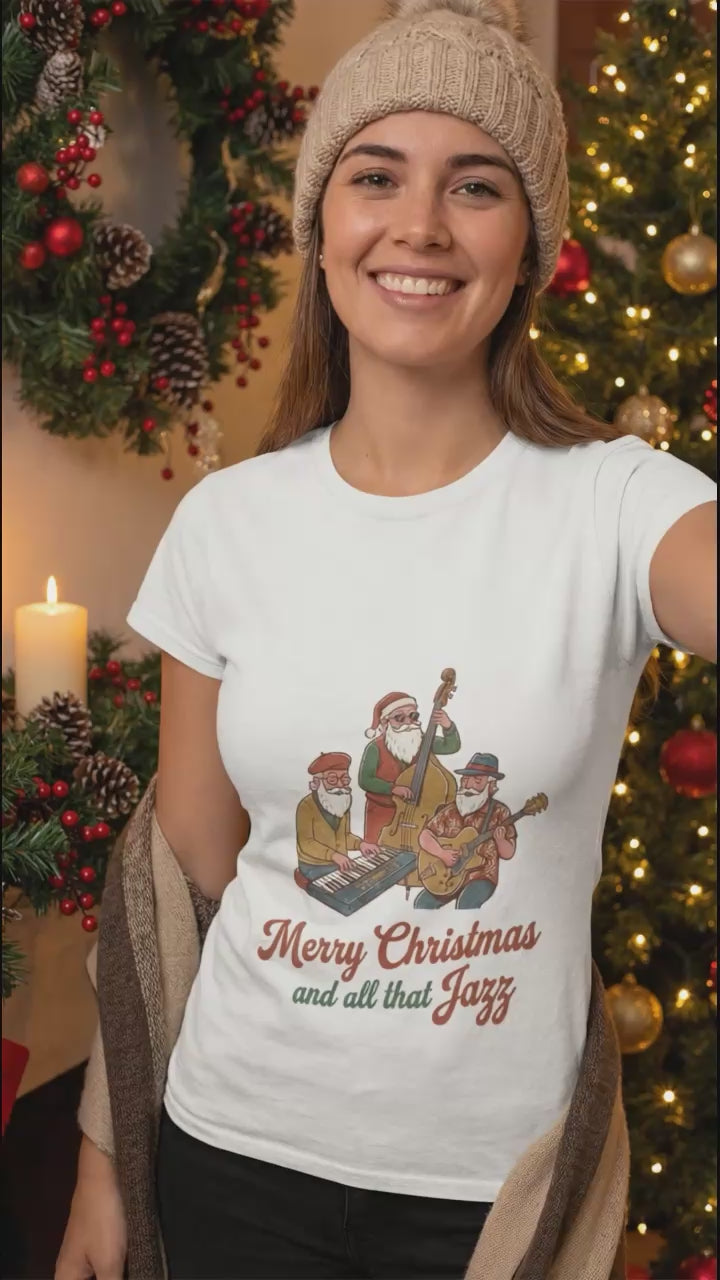 Celebrate the season with style in this Merry Christmas and All That Jazz tee, featuring a charming illustration of three retro Santas jamming on keys, upright bass, and electric guitar. It’s the perfect blend of holiday cheer and musical flair.