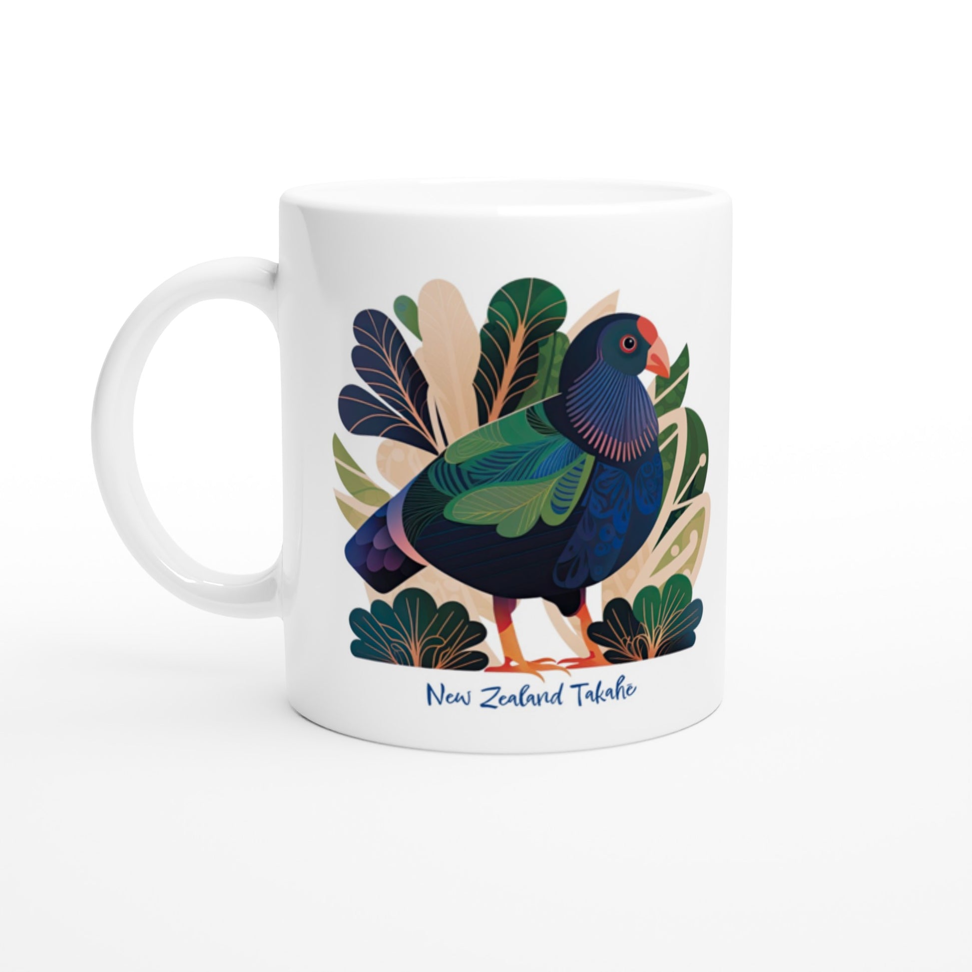 The star of the design is the New Zealand Takahe bird, known for its vibrant blue plumage, stout build, and striking red beak. With intricate details and vibrant colors, the artwork on the mug showcases the bird's distinctive features, allowing you to appreciate its beauty with every sip.