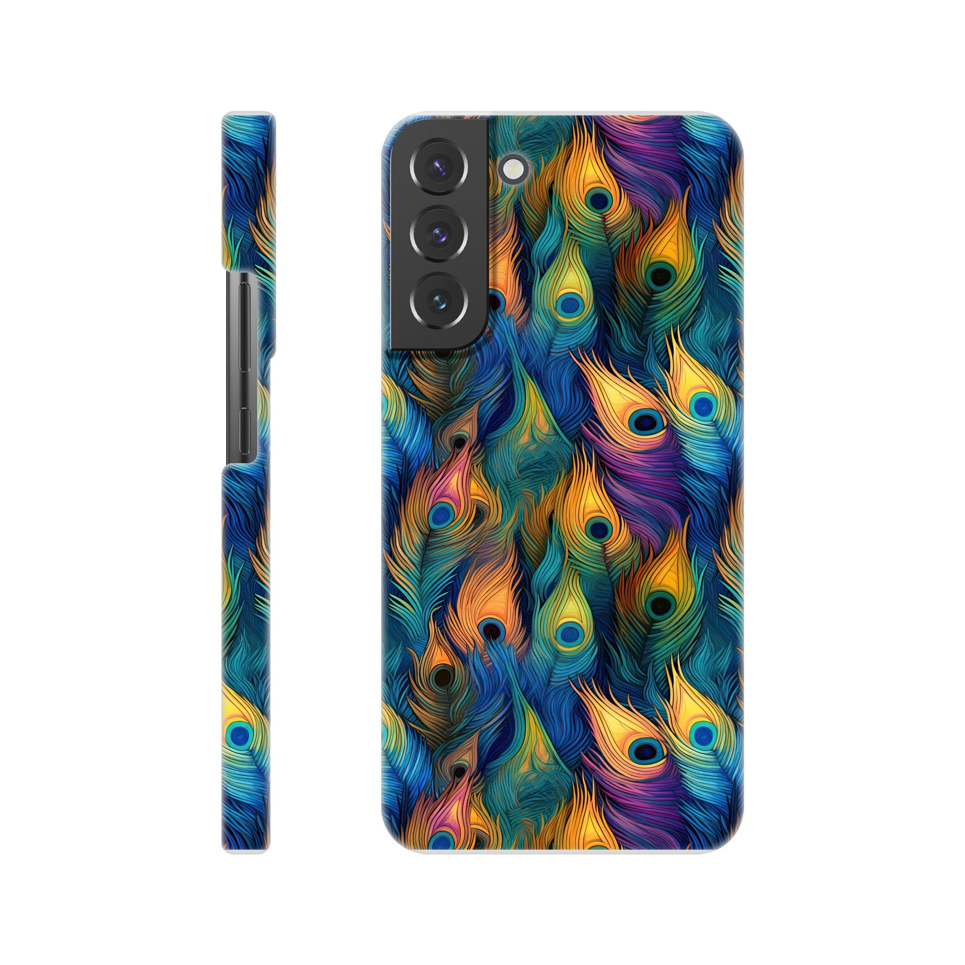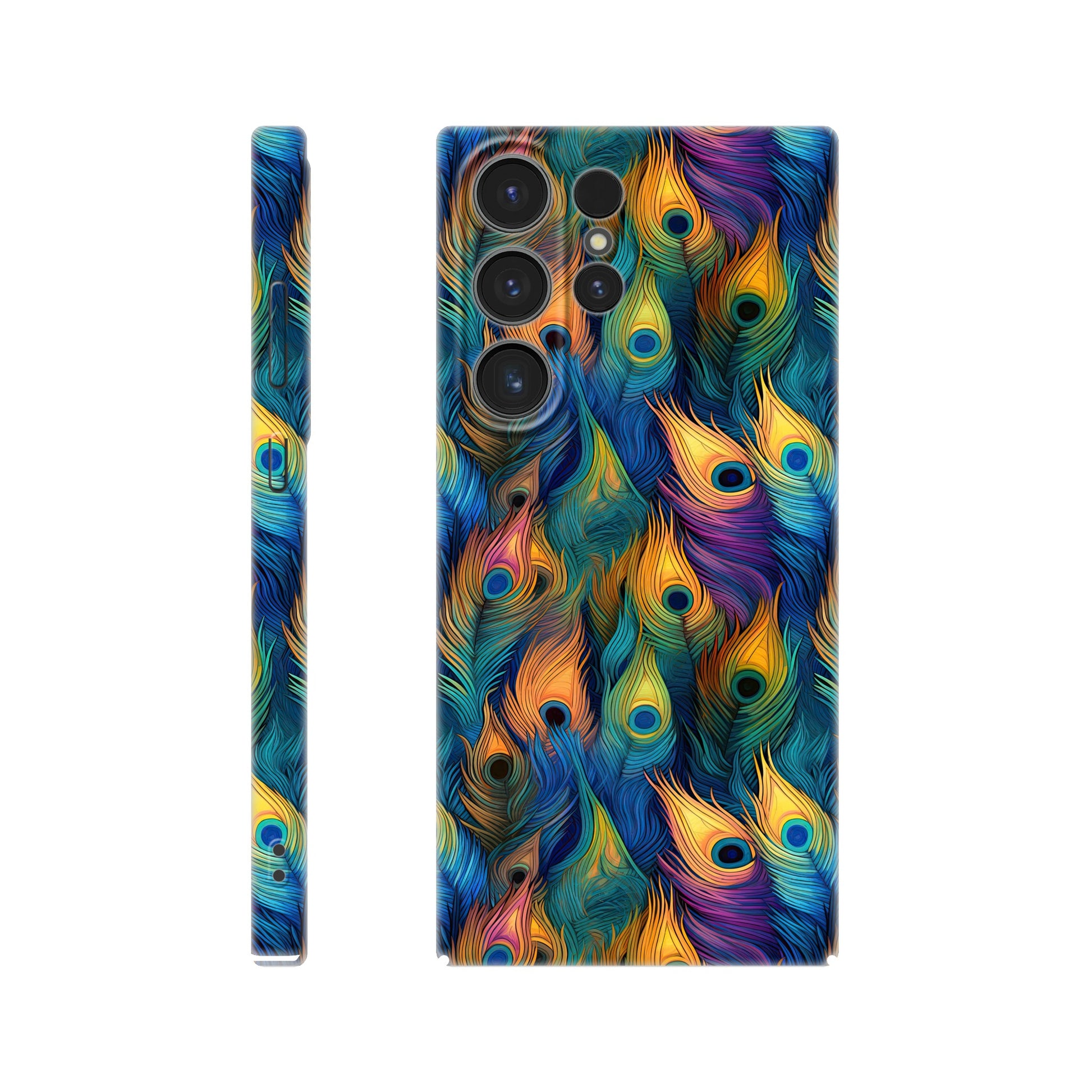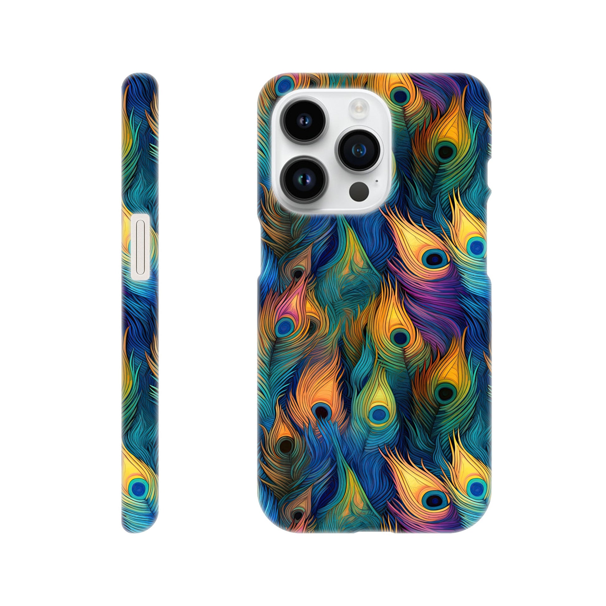 Introducing our vibrant and stylish Slim Phone Case adorned with a captivating all-over peacock feather print, designed to complement your Android and Apple devices!
