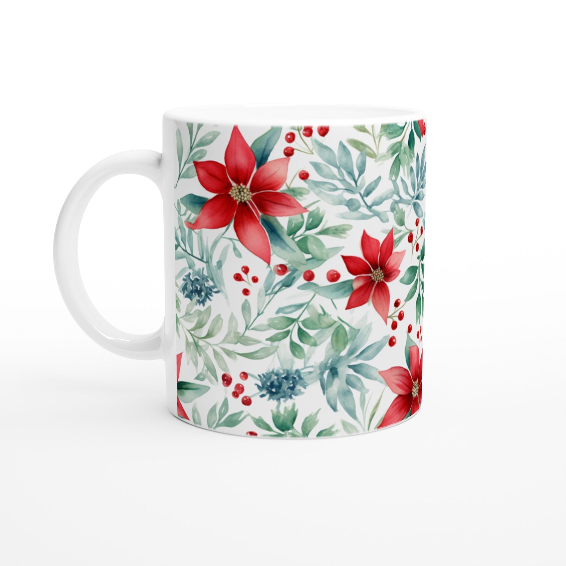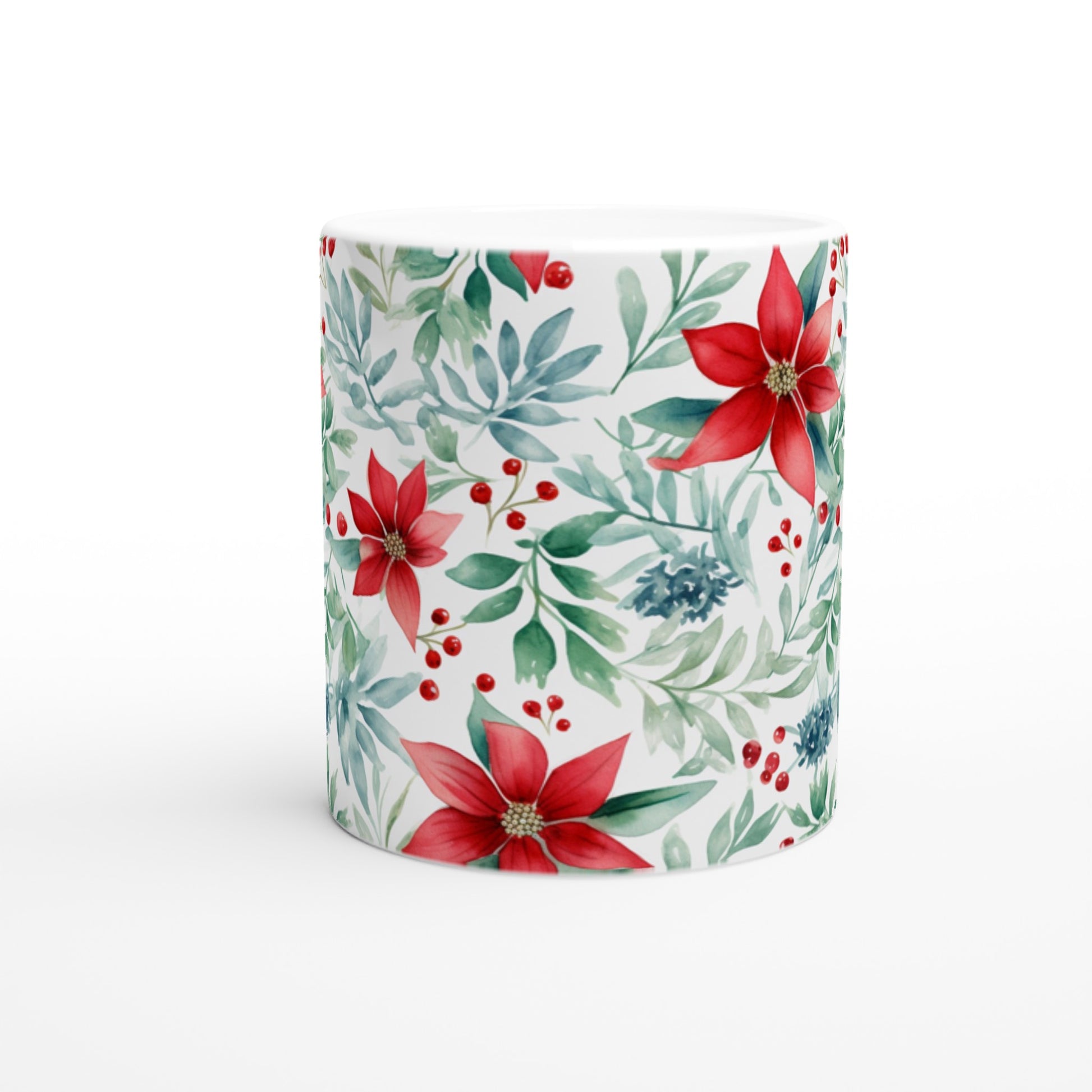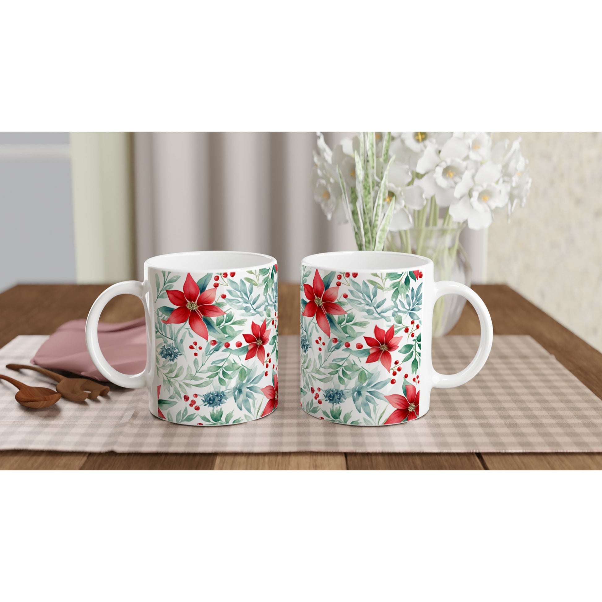 Joyful Sips: 11oz Ceramic Mug with Watercolor Christmas Poinsettia Flowers Print