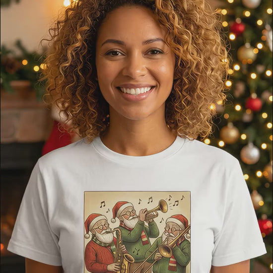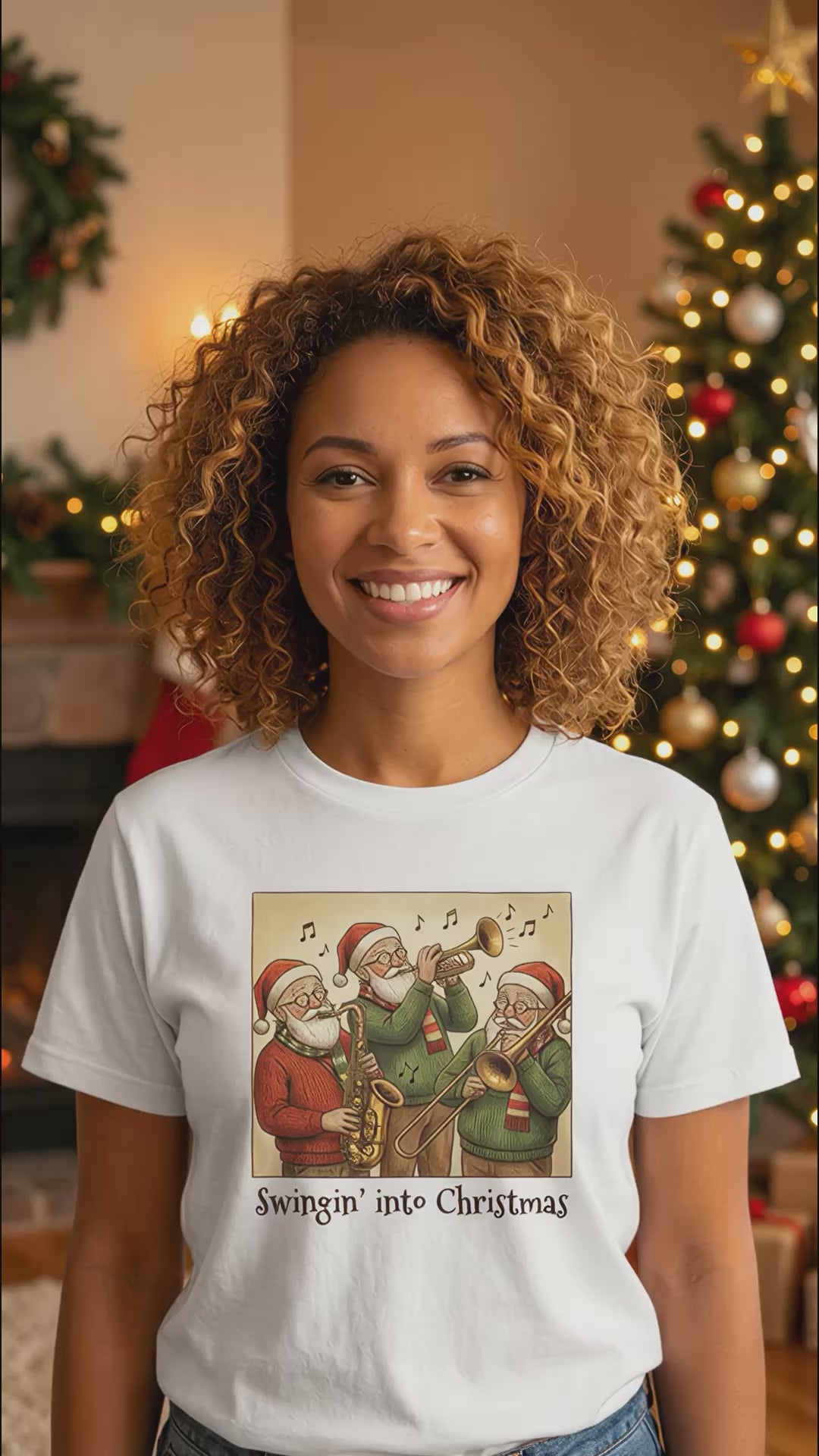 Step into the holiday groove with Swingin’ into Christmas, a fun and vintage-inspired illustration featuring three cheerful Santas playing saxophone, trumpet, and trombone. With warm colours, cosy jumpers, and a retro jazz vibe, this design is perfect for anyone who loves music and festive fun.